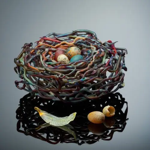 Theofanous began her exploration of glass in 2004, and developed a technique for weaving glass that became the foundation of much of her body of work. Collaboratively she works with Dean Bensen, to explore hyperrealism in natural forms, including large scale installations. Internationally recognized for her sculpture, Theofanous’ notable exhibitions include: The Ming Shangde Glass Museum in China, The Triennial of the Silicate Arts in Hungary, the Imagine Museum in Florida, the Museum of Northern California Art, and the Bellevue Arts Museum in Washington. As an educator she has taught at top institutions such as Pratt Fine Arts Center in Washington and Pittsburgh Glass Center. She also serves as Board President of the Glass Alliance of Northern California, Board Member of the Glass Art Society, and Advisory Board Member of Art Alliance of Contemporary Glass.